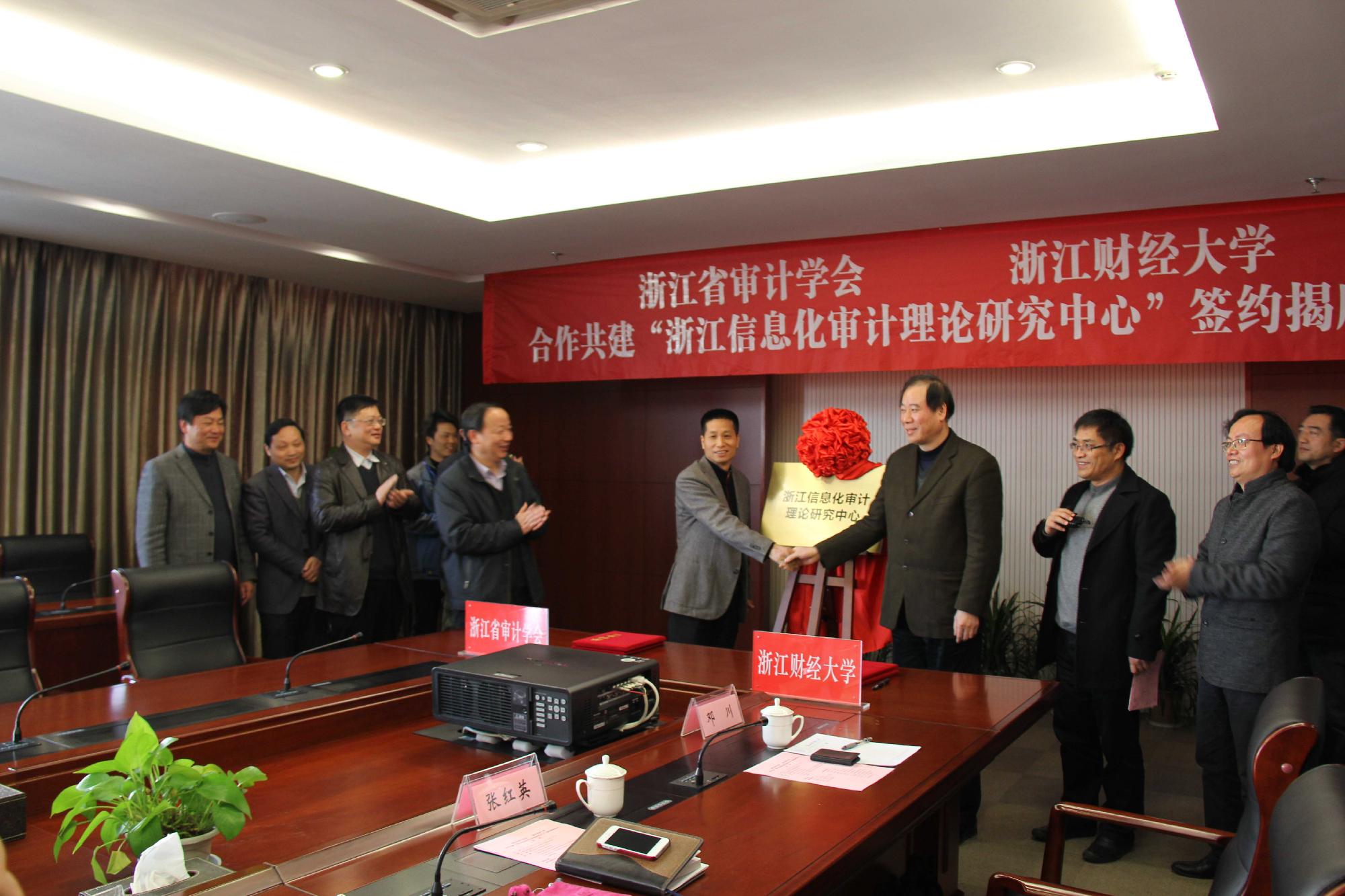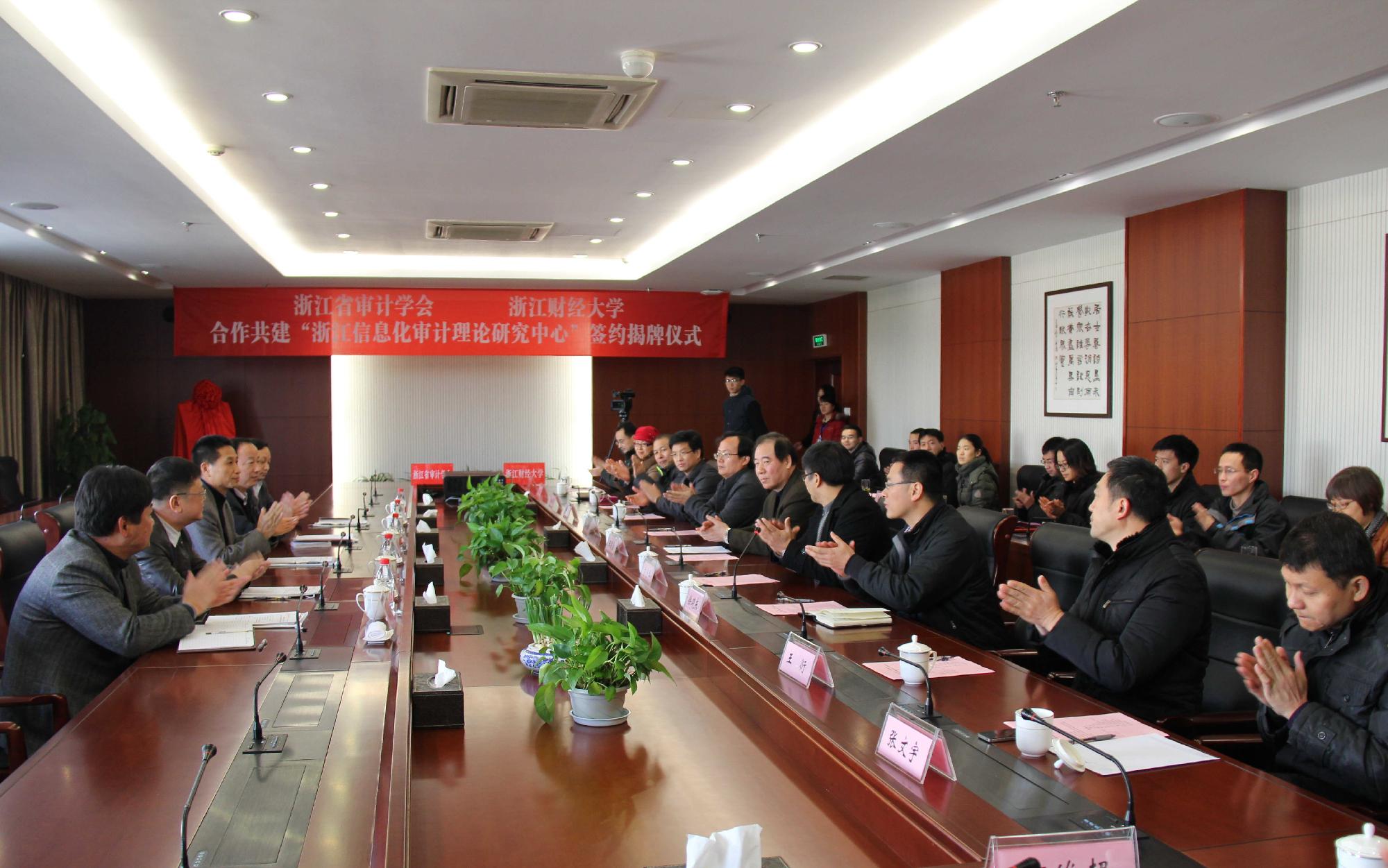 12月30日上午,“浙江信息化审计理论研究中心”签约暨揭牌仪式在我校行政楼会议室举行。浙江省审计厅副厅长王小龙、总审计师金建培、经济责任审计处三处处长姜英杰、审计中心主任周仲利、审计科研所所长甘伟军,校长王俊豪、副校长苏为华、副校长黄建新出席仪式,党校办、科研处、计财处、信息台湾av、会计台湾av的负责人和教师代表共计30余人参加仪式。