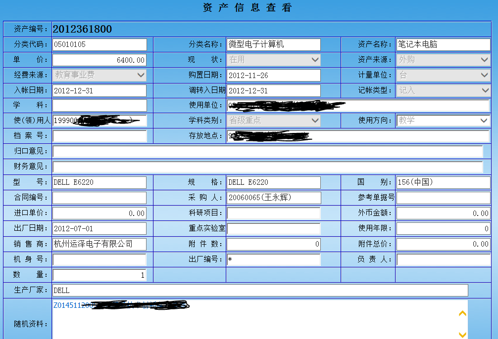 可以看到设备的详细信息,如购置日期,型号规格,随机资料(经费支出来源)