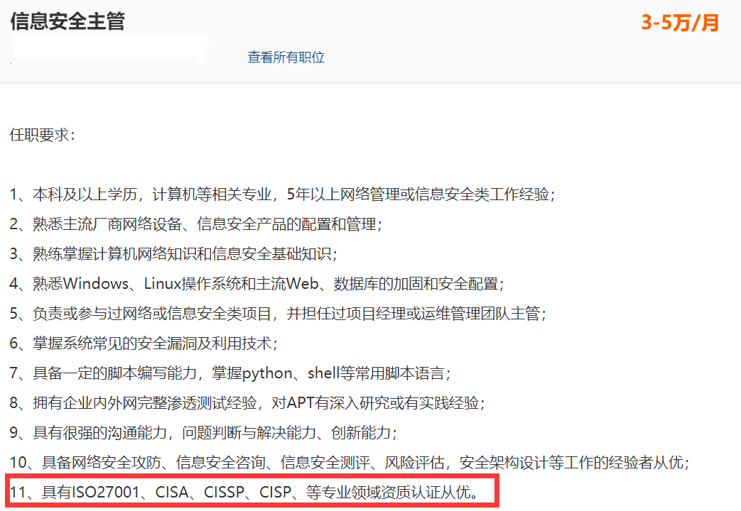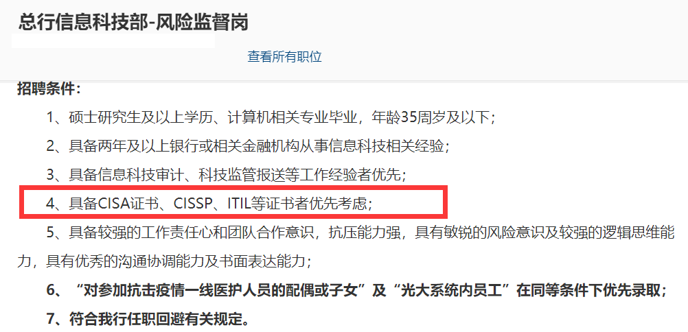 上海市2021年6月发布的上海市重点领域 (金融类) “十四五”紧缺人才开发目录中列出的紧缺程度达两颗星的金融审计人才,明确要求需要具有CISA。